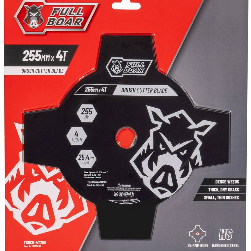 This Full Boar 4-Tooth Brush Cutter Blade with Ø25.4mm (1’) bore is made from high-quality hardened steel and is suitable for use with a wide range of brush cutters. Use to mow and remove thick, dry grass quickly and effectively, as well as combat dense weeds, reeds and thin bushes. This trade-quality blade with 4 cutting edges will remain sharp for a long time even during intensive use.